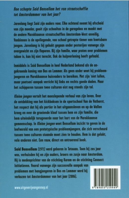 Jarenlang liegt Said zijn ouders voor. Elke ochtend neemt hij afscheid van zijn moeder, gooit zijn schooltas in de garagebox en maakt met de andere Marokkaanse straatschoffies Amsterdam-West onveilig. Vanbinnen is de opvliegende, van school getrapte tiener een kwetsbare jongen. Jarenlang is hij gebukt gegaan onder pesterijen vanwege zijn overgewicht en zijn flaporen. Bij zijn familie, waar praten over problemen taboe is, kan hij niet terecht. Ook de hulpverlening heeft gefaald. Inmiddels is Said Bensellam in heel Nederland bekend als de ongekroonde koning van Bos en Lommer. Als geen ander weet hij probleemjongeren en Marokkaanse huisvaders te bereiken. Met zijn 'niet lullen, maar poetsen'-aanpak verricht hij links en rechts goede daden. Maar het schipperen tussen twee culturen eist nog steeds zijn tol. 'Kleine jongen' vertelt het meeslepende verhaal van zijn leven. Over de ontdekking van het kickboksen in de sportschool Van de Vathorst, het respect dat hij als portier in het uitgaansleven en op de Wallen kreeg en de groeiende kloof tussen hem en zijn familie, die hem uiteindelijk terugvoerde naar het hart van de Marokkaanse gemeenschap. Hem is dat gelukt, vele anderen niet. Een rauw, direct en ontroerend boek.