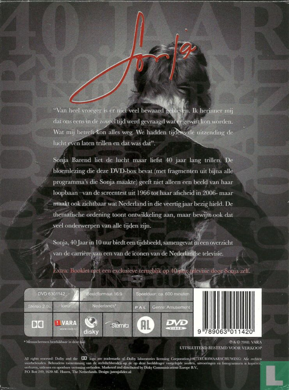 Kijk mee door de 40 mooie jaren van Sonja Barend Beeld: 16:9 Geluid: Dolby Digital 2.0 Taalkeuze: Nederlands Extra's: Booklet met een exclusieve terugblik op 40 jaar televisie door Sonja zelf