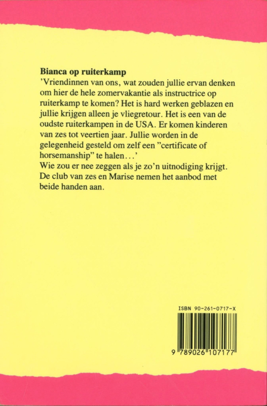 Vriendinnen van ons, wat zouden jullie ervan denken om hier de hele zomervakantie als instructrice op ruiterkamp te komen? Het is hard werken geblazen en jullie krijgen allemaal een vliegretour. Het is een van de oudste ruiterkampen in de U.S.A. Er komen kinderen van 6-14 jaar. Jullie worden in de gelegenheid gesteld om zelf een 'certificate of horsemanship' te halen... Wie zou er nee zeggen als je zo'n uitnodiging krijgt. De club van zes en Marise nemen het aanbod met beide handen aan.