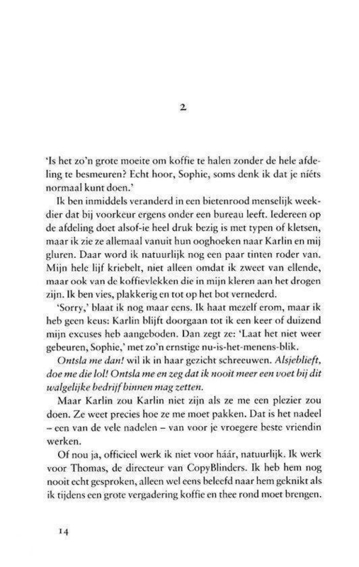 Sophie baalt van haar nietig baantje bij het grote reclamebureau CopyBlinders. Dat haar vroegere beste vriendin Karlin haar baas is geworden en een relatie heeft met Sophies grote liefde Rein, helpt ook niet mee. Als Sophie voor de zoveelste keer vernederd wordt, is de maat vol: ze neemt het heft in eigen handen. Hou je vast!