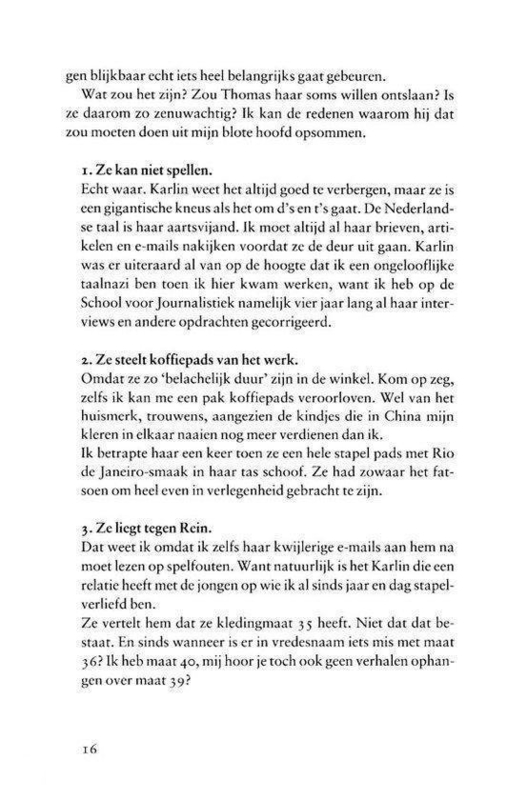 Vanaf het begin zit het boek vol humor en vraag ik me af waar Lisette Jonkman dit allemaal haalt. Ik heb vaak met een lach op mijn gezicht gezeten. Ook met de "wraak" op het einde van het boek, had ik zo'n vals 'haha-gevoel'. Eigen schuld, dikke bult!