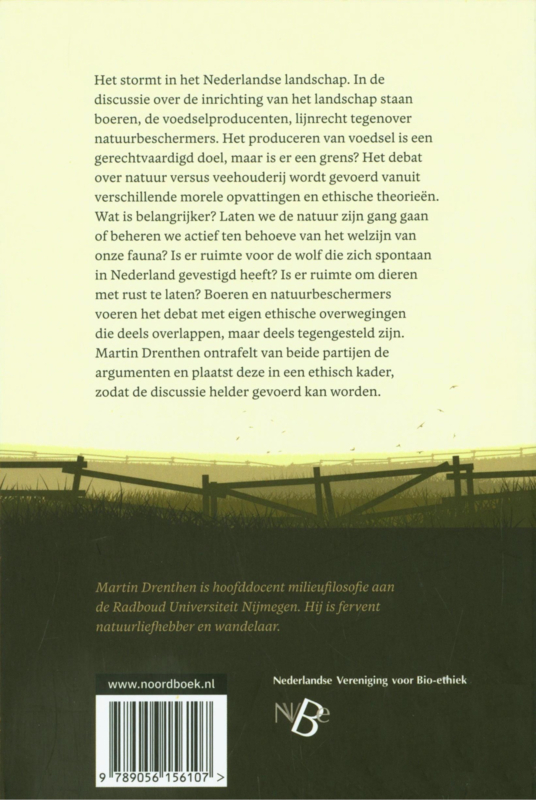 Het stormt in het Nederlandse landschap. De maatschappij is verzeild geraakt in een verhitte discussie over de manier waarop we ons landschap moeten gebruiken. De actuele discussie over de wijze waarop wij in Nederland ons voedsel produceren, wordt gevoed door de stikstofdiscussie en bijvoorbeeld de komst van de wolf. Het produceren van voedsel is een gerechtvaardigd doel, maar waar ligt dan de grens? De verschillende posities in het debat over natuur versus veehouderij worden ondersteund vanuit verschillende morele opvattingen en ethische theorieën. Wat is belangrijker? Het actief waarborgen van het welzijn van onze fauna of moeten we de natuur zoveel mogelijk met rust laten? De Nederlandse boeren mengen zich fel in het debat, met een eigen pakket aan ethische overwegingen die deels overlappen met, maar deels ook tegengesteld zijn aan die van de natuurbeschermers. Martin Drenthen ontrafelt van beide partijen de argumenten en plaatst deze in een ethisch kader, zodat de discussie met alle voors en tegens in ieder geval helder gevoerd kan worden.