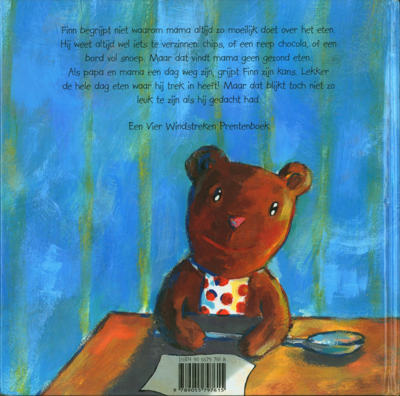 Finn begrijpt niet waarom mama zo moeilijk doet over het eten. Hij weet altijd wel iets te verzinnen: chips, of een reep chocola. Maar dat vindt mama geen gezond eten. Als papa en mama een dag weg zijn, grijpt Finn zijn kans. Lekker de hele dag eten waar hij trek in heeft (snoepen)! Maar dat blijkt toch niet zo leuk te zijn als hij gedacht had, want hij krijgt enorme buikpijn.