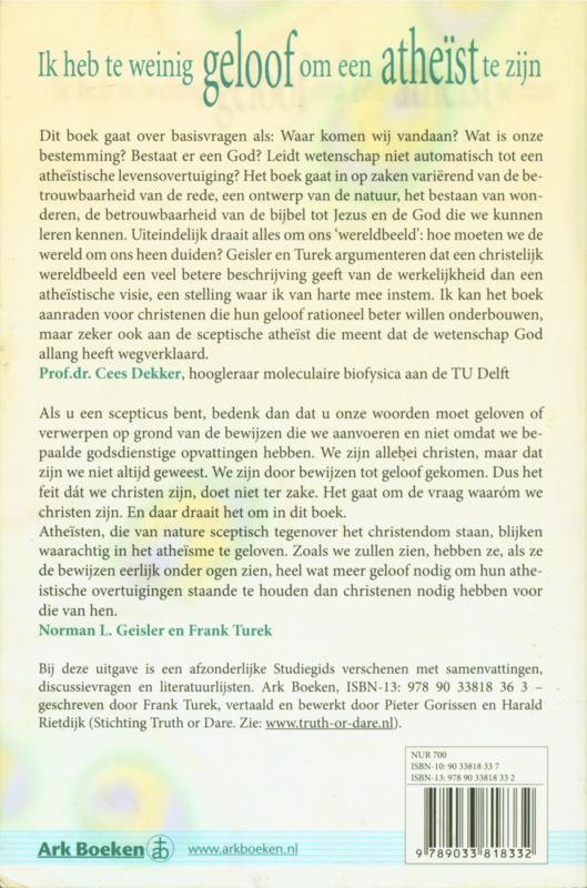 Geisler en Turek zijn Amerikaanse wetenschappers die stellen dat er veel verstandelijke argumenten zijn voor het bestaan van God. Sterker nog, zij menen dat je meer geloof nodig hebt om met je volle verstand atheïst te kunnen zijn! Stap voor stap bouwen de auteurs hun betoog op. Ze gaan uitvoerig in op argumenten voor het bestaan van God en voor een goddelijke oorsprong van het heelal en het leven op aarde. Hiermee sluiten zij aan bij de actuele discussie over Intelligent Design. Daarbij stellen ze zichzelf de vijf belangrijkste vragen in het leven: waar komen we vandaan, wie zijn we, waarom zijn we hier, hoe moeten we leven en waar gaan we naartoe? Vervolgens behandelen Geisler en Turek het bestaan van een morele wet (universeel geldige waarden die alleen door God gegeven kunnen zijn), het geloof in wonderen en de historische betrouwbaarheid van het Nieuwe Testament. Dit boek zet kwesties rond geloof en wetenschap op een toegankelijke manier uiteen voor een breed publiek. Het is een goed onderbouwd en overtuigend geschreven betoog waarin ook de wetenschappelijke aspecten begrijpelijk zijn weergegeven! Een waardevol boek voor christenen die in een seculiere omgeving hun "irrationele" geloof willen kunnen onderbouwen. Bovendien zeer geschikt voor mensen die serieus op zoek zijn naar antwoorden op de grootste levensvragen. Dr. Frank Turek heeft diverse universitaire graden behaald. Hij heeft management en leiderschap gedoceerd aan de George Washington University in Washington, D.C. Als senior partner van The Austin Group verzorgt hij trainingen voor het bedrijfsleven. Dr. Norman Geisler is filosoof en als president en senior pastor verbonden aan het Southern Evangelical Seminary and Bible College in Charlotte, North Carolina. Hij kreeg voor een van zijn boeken de Gold Medallion Award en ontving de Silver Medallion Award voor zijn Baker Encyclopedia of Christian Apologetics.