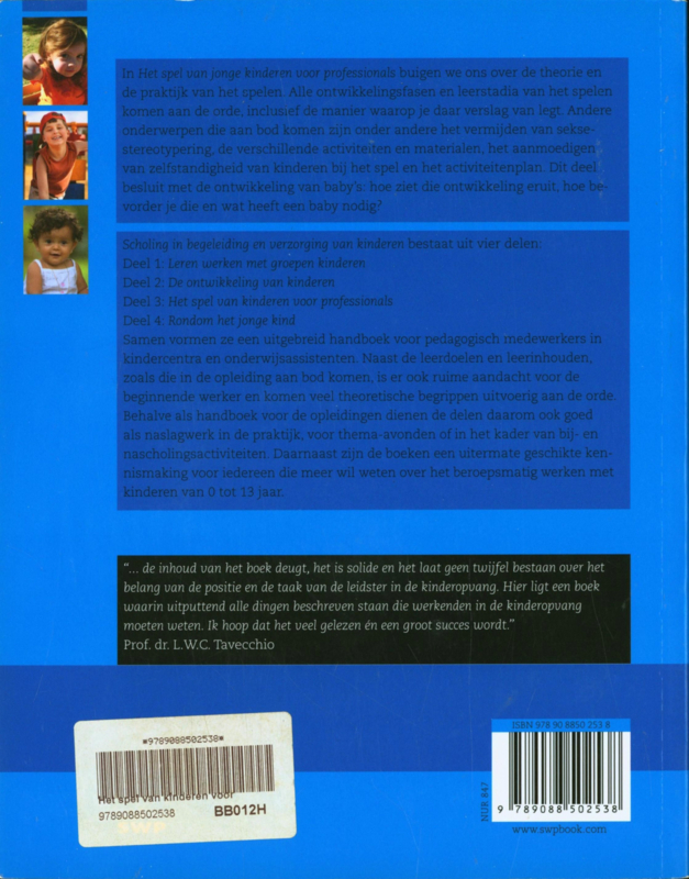 In Het spel van jonge kinderen voor professionals buigen we ons over de theorie en de praktijk van het spelen. Alle ontwikkelingsfasen en leerstadia van het spelen komen aan de orde, inclusief de manier waarop je daar verslag van legt. Andere onderwerpen die aan bod komen zijn onder andere het vermijden van seksestereotypering, de verschillende activiteiten en materialen, het aanmoedigen van zelfstandigheid van kinderen bij het spel en het activiteitenplan. Dit deel besluit met de ontwikkeling van babys: hoe ziet die ontwikkeling eruit, hoe bevorder je die en wat heeft een baby nodig?