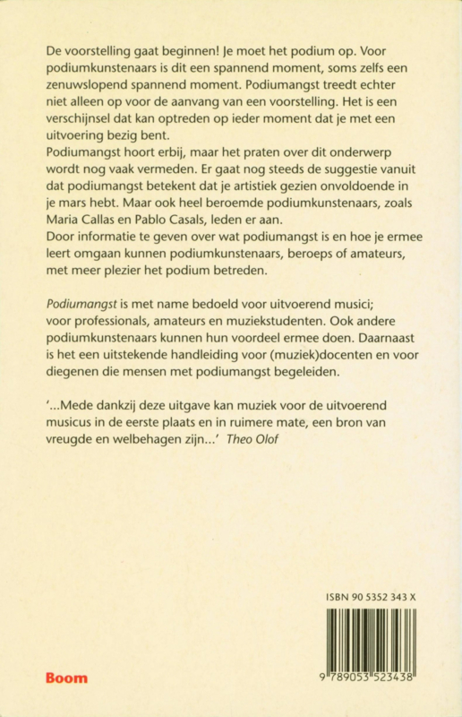 Op heldere wijze wordt in dit boek uitgelegd wat podiumangst is, welke factoren een rol spelen en hoe je er mee om kunt gaan.