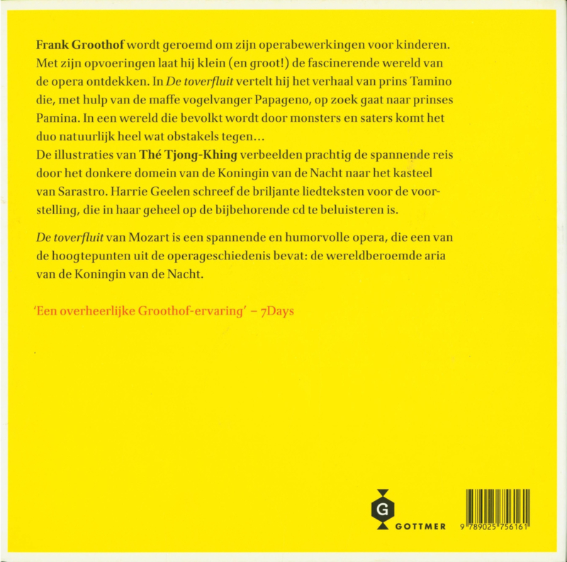 De toverfluit is het derde operaboek van Frank Groothof en Thé Tjong-Khing. Frank Groothof trekt met zijn operabewerkingen volle zalen. En de pers is unaniem lovend over de rasverteller. Maar niet iedereen heeft de gelegenheid om naar het theater te gaan. En dat hoeft ook niet, want met de muziekboeken van Gottmer kan er thuis volop genoten worden. Ook deze uitvoering is weer prachtig vormgegeven en bestaat uit een cd met daarop de hele voorstelling (inclusief de fantastische liedteksten van Harrie Geelen) en daarnaast een luxe geïllustreerd boek waarin het verhaal nog eens in het kort wordt naverteld. Die bewerking gaat vergezeld van prachtige illustraties van Thé Tjong-Khing.