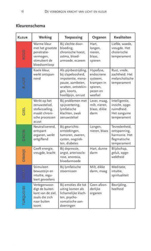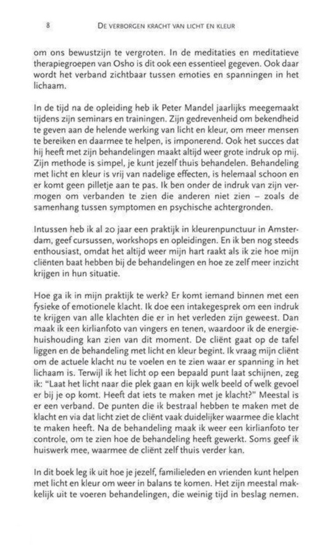 Licht doet leven. Zonder zonlicht zou er geen leven op deze aarde mogelijk zijn. Het wonderbaarlijke van licht en kleur is bovendien dat ze gebruikt kunnen worden om de harmonie in ons lichaam te herstellen. Met als gevolg: - je krijgt meer vitaliteit en gezondheid - je klachten worden letterlijk verlicht - je immuunsysteem wordt sterker en - je ervaart een diepe ontspanning