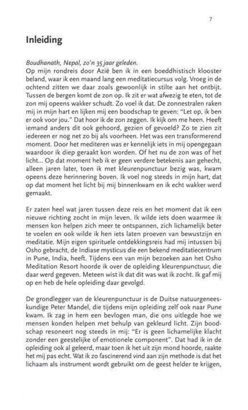 De grote verdienste van Praveeta Timmerman is dat zij in staat is de opgedane kennis te integreren, verder te ontwikkelen en door te geven. Dit boek is de vrucht van haar doorleefde ervaring en haar jarenlange inzet en toewijding. Ik ben er zeer verheugd over, omdat zij de methodiek van de kleurenpunctuur doorgeeft ten behoeve van het welzijn van iedereen. Peter Mandel Praveeta Timmerman is de oprichtster van het Instituut voor Kleurenpunctuur, een praktijk voor licht- en kleurtherapie. Daarnaast organiseert zij workshops, trainingen en bij- en nascholingsdagen over onder meer licht- en kleurtherapie en kirlianfotoanalyse voor holistisch werkende therapeuten. Vooral de combinatie van wetenschap en oude spirituele wijsheid en esoterie vindt zij fascinerend in de kleurenpunctuur. Het belangrijkste is echter het bewustwordingsaspect. De behandelingen gaan namelijk veel verder dan het louter oplossen van directe klachten of het kwijtraken van symptomen: er ontstaat inzicht op een dieper niveau. Praveeta Timmerman volgde de opleidingen Esogetische Kleurenpunctuur en Kirlianfotografie, o.m. aan het Mandel Institut für Esogetische Medizin in Bruchsal, Duitsland en het International Osho Meditation Resort, Pune, India. Ze volgt regelmatig bijscholingen en vervolgcursussen onder leiding van Peter Mandel.
