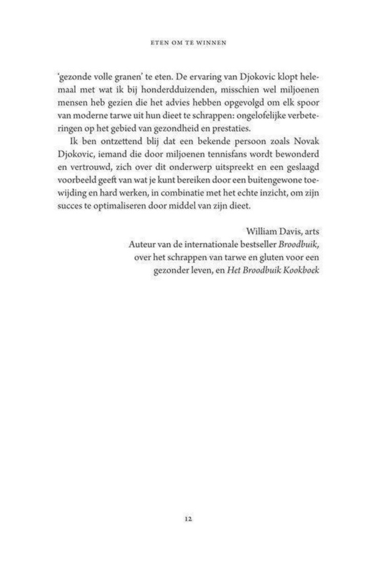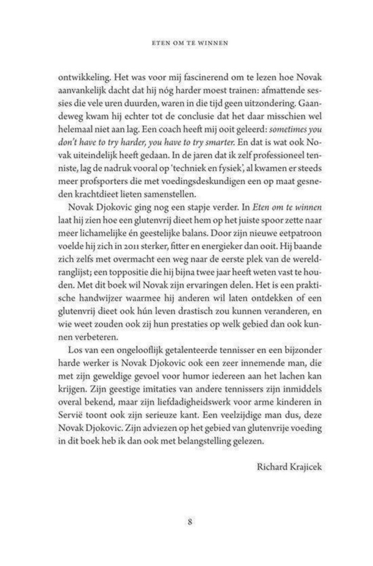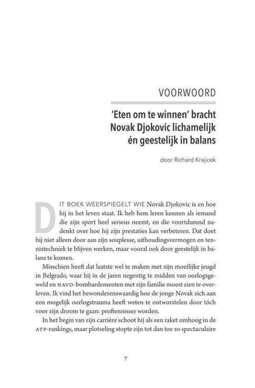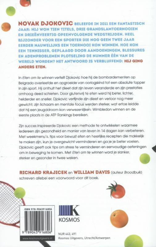 In Eten om te winnen vertelt Novak Djokovic zijn bijzondere levensverhaal. Hij beschrijft hoe hij het bombardement op Belgrado overleefde en van oorlogskind opgroeide tot ’s werelds beste tennisser. In 2011 won hij bijna alles wat er te winnen viel met tennis. Novak Djokovic is nu een van de grootste tennisspelers aller tijden. Hij onthult dat zijn sportieve overwinningen voor een groot deel te danken zijn aan de verandering van zijn voeding: hij is glutenvrij gaan eten. Mentaal en fysiek voelde hij zich daardoor een stuk beter en kon hij zijn dromen waarmaken. Eten om te winnen bevat een voorwoord van Richard Krajicek. Ook William Davis, de auteur van Broodbuik, schreef een voorwoord. In het boek is een glutenvrij 14-dagendieet, met recepten en praktische tips, opgenomen. Een inspirerend sportvoedingsboek en autobiografie van de beste glutenvrije tennisser ter wereld!