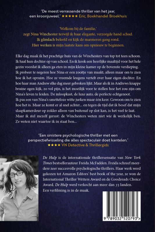 De Hulp is de internationale thrillersensatie van New York Times-bestsellerauteur Freida McFadden. Freida schreef meerdere zeer succesvolle psychologische thrillers. Haar werk werd gekozen tot Amazon Editors’ best book of the year, ze won de International Thriller Writers Award en de Goodreads Choice Award. De Hulp werd verkocht aan meer dan 35 landen.